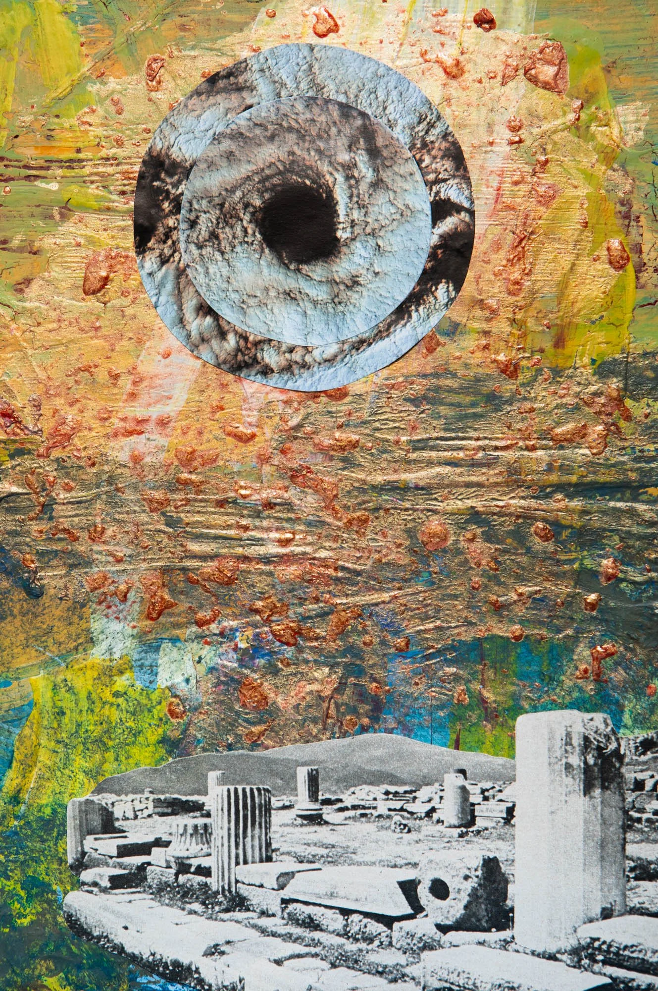 “Astronomical Alignment” Collage & Mixed Media on Board, 2021.